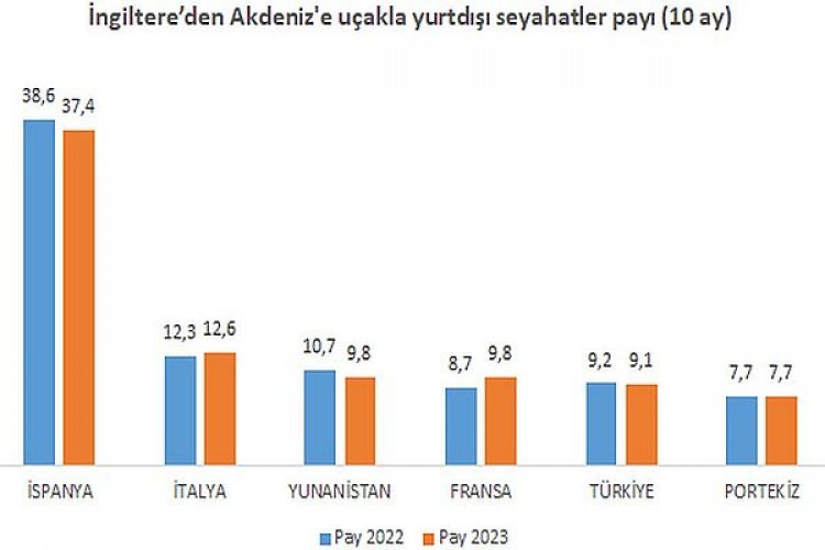 İngiltere’den Akdeniz ülkelerine yapılan yurtdışı seyahatler (Geliş-gidiş), bu dönemde 101 milyonu aşarken, İspanya % 37,4 payla (-1) ilk sırada. Onu % 12,6 payla İtalya ve % 9,8 payla Fransa izledi.