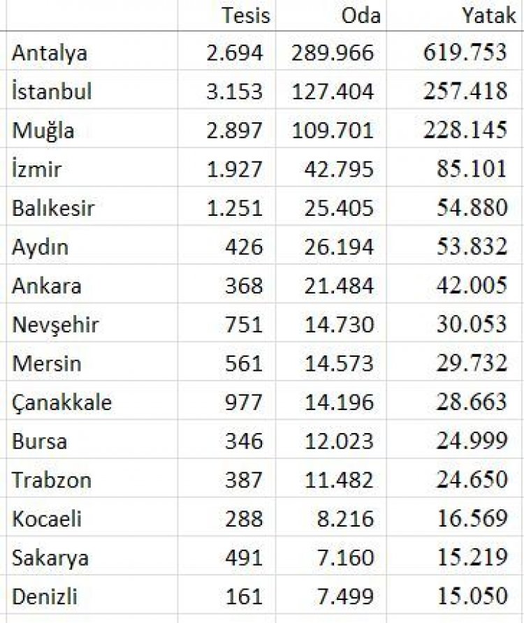 Turizmdatabank'ın derlediği verilere göre illerdeki otel ve yatak kapasiteleri şu şekilde açıklandı. İllere göre tesis, oda ve yatak kapasitelerinin yer aldığı rapora göre; Antalya dev yatak kapasitesiyle "turizmin başkenti" unvanını korurken, İstanbul en çok tesis sayısına sahip il olarak öne çıktı.